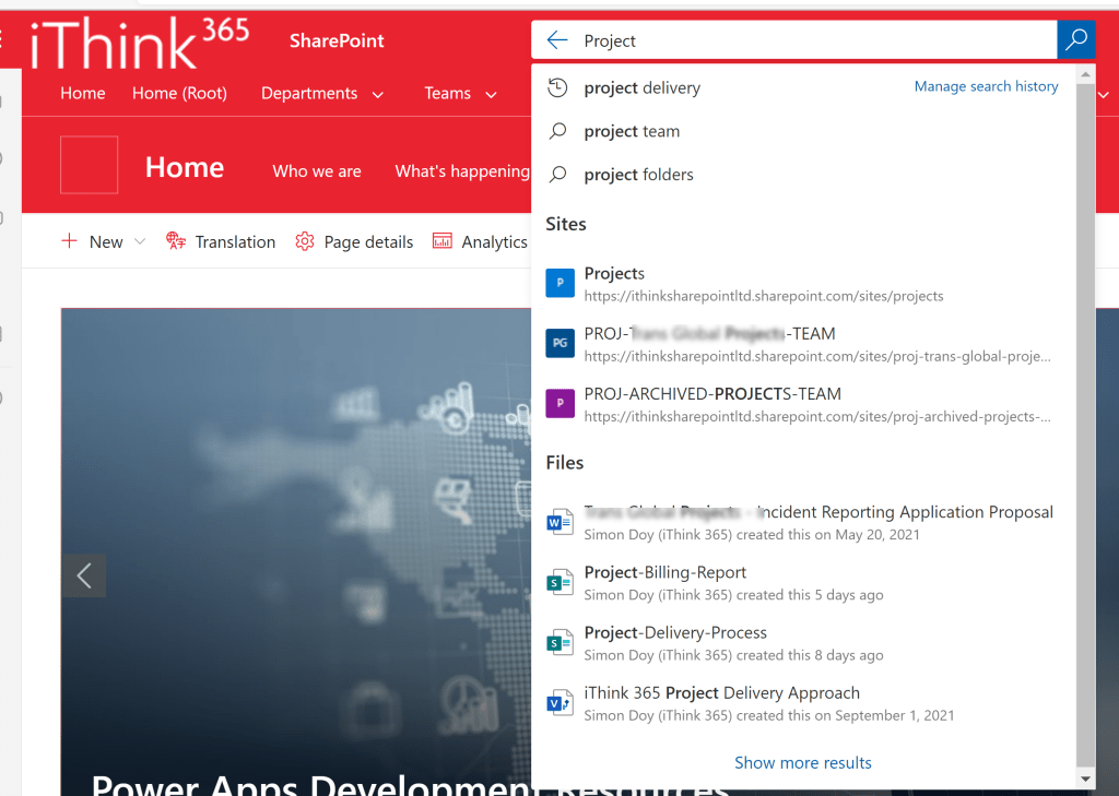 You can see a summary of search results but if you click on “Show more results” then this expands to a dedicated search results page. This results page allows you to refine the search across different categories (called search verticals) to make it easier to find the right resource. By default, these search verticals include things like filtering to just files, people, news, and images.