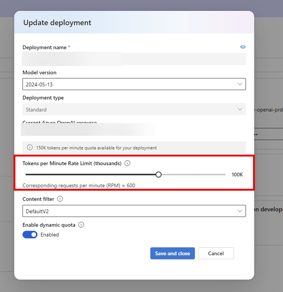 You can do this using the Azure Open AI Studio by going to the Deployments, choosing your model and then editing the model settings and increasing the Tokens Per Minute Rate Limit. For testing we are setting this to 100K but for Production, you are likely to need to increase further.