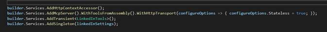 That is right, the WithHttpTransport function has an override where you can pass in configuration options. One of them is Stateless,s and setting this to true will mean that your MCP Server behaves quite differently and does not go through the process of checking session IDs etc.