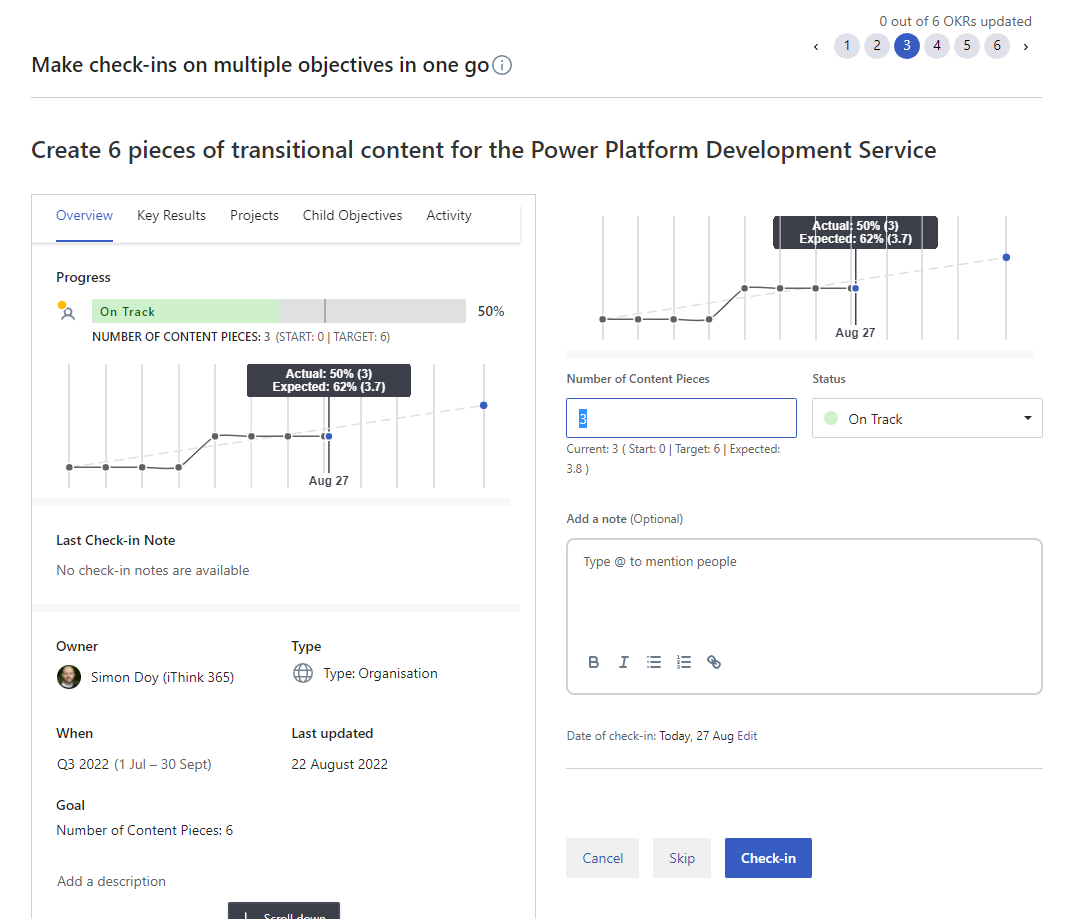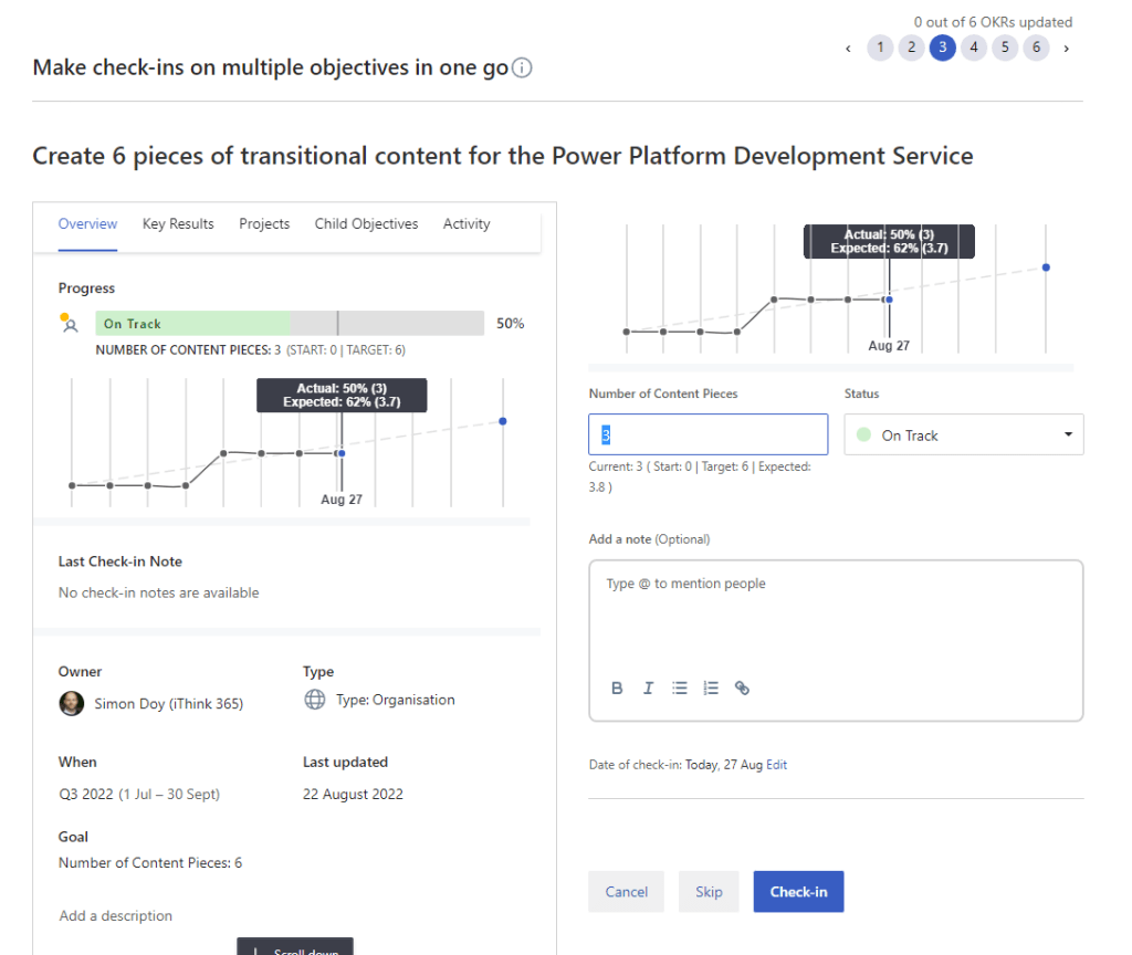 The Key results need to be updated regularly so that we can track the objectives and see if we are on track, ahead or behind. Viva Goals achieves this in one of two ways. Key results can be manually updated in which case the user who owns the key result is prompted to check-in every week to update the metric.
