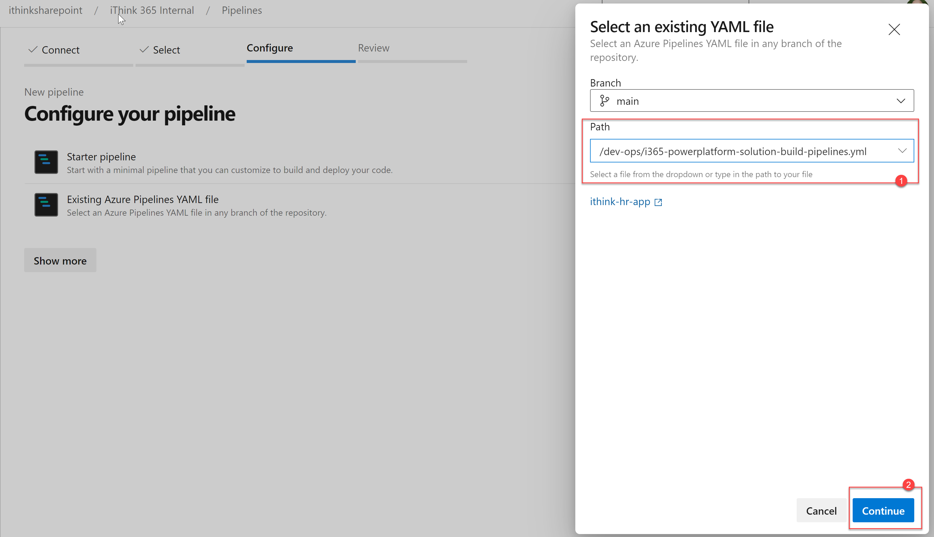 - From the path drop-down select the pipeline i365-powerplatform-solution-build-pipeline.yml