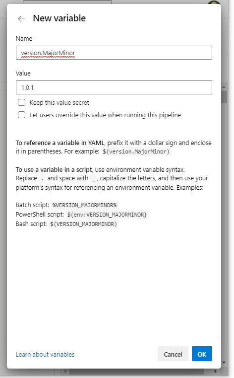 Next, we need to add a variable called PowerPlatformSolutionName. This is slightly different as it is the name of the solution zip file. So, use the value that you used for the build pipeline but add Solution.zip to the end.