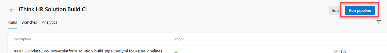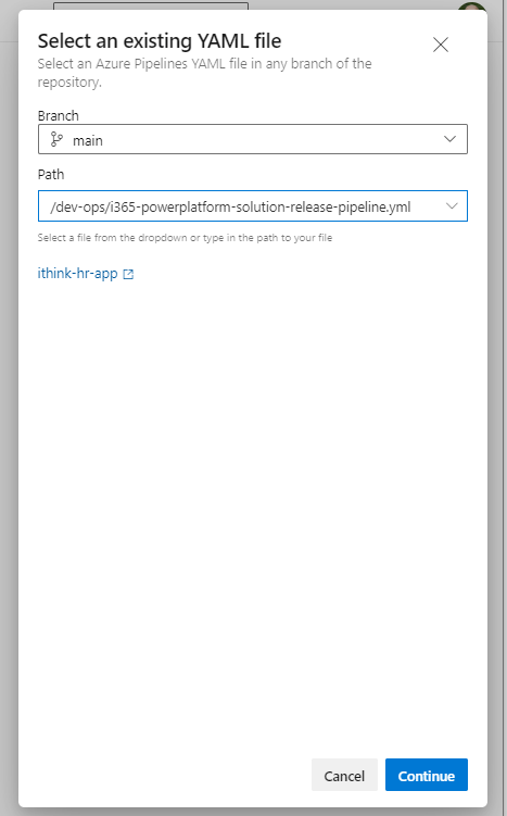 - From the path drop-down select the pipeline i365-powerplatform-solution-release-pipeline.yml