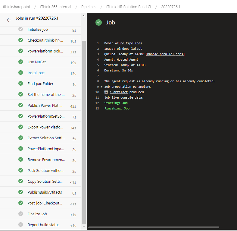 The Build pipeline oversees publishing all customisations and exporting the solution out. It also unpacks the solution and associates the artifacts to a published asset which is attached to the build.