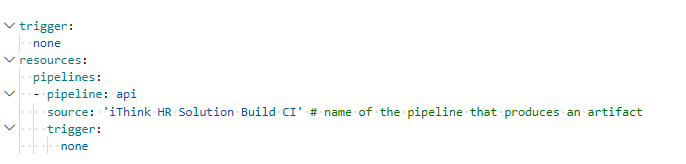 In deployment/release pipelines you need to specify the assets that you are going to release. This is done by the resources section as you can see this reference’s the build pipeline which we are giving an alias of api. The source is the name of the build pipeline that creates the resources. Finally, the trigger statement is set to none. Which means that when the build pipeline completes this release process will not trigger. However, we can change that if we wish to.